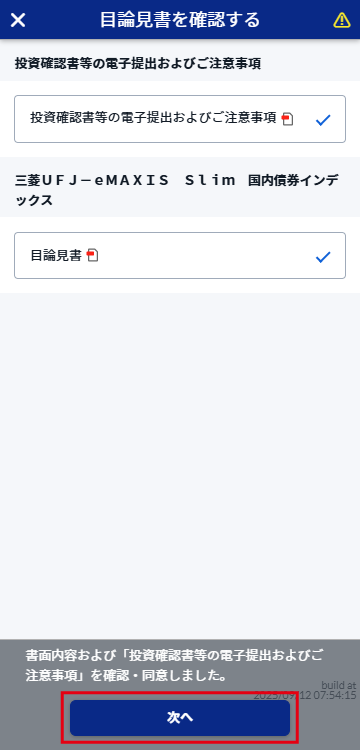 「目論見書を確認する」画面では、未確認の書面があると、項目の背景が黄色で表示されます。すべての書面を確認すると次の手順に進めるようになります。