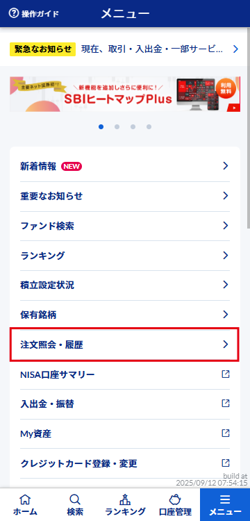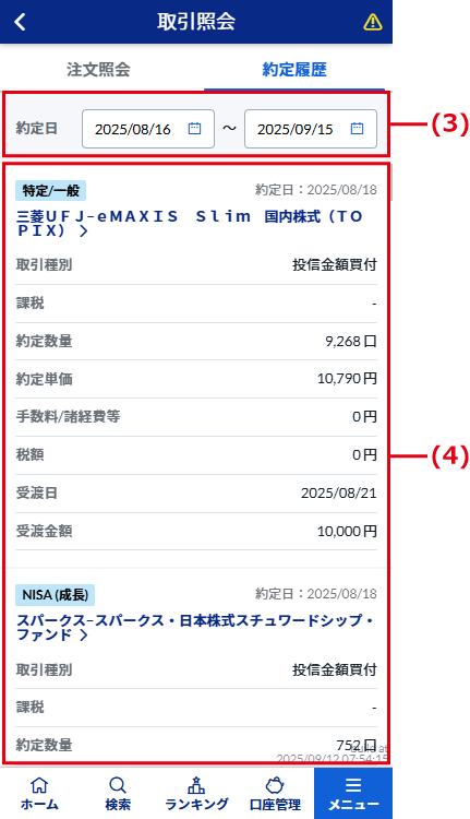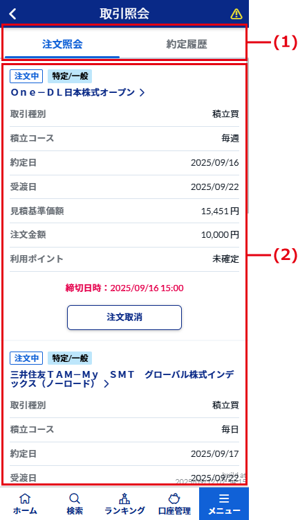メニューで「注文照会・履歴」をタップすると、「取引照会」画面が表示されます。