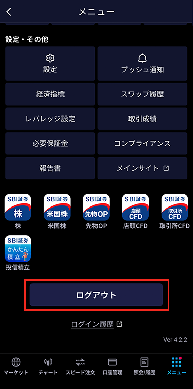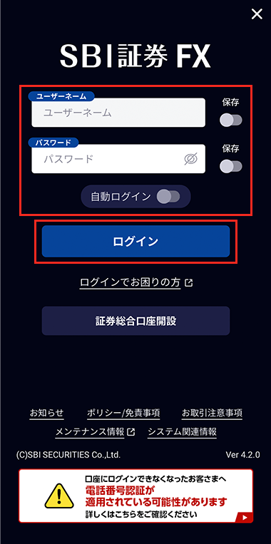 SBI証券 FXアプリを使用いただくには、SBI証券の証券総合口座および外国為替保証金取引口座を開設していただく必要があります。まだ証券総合口座を開設していない場合は、「証券総合口座開設」ボタンをタップすると、口座開設のお手続きができます。
