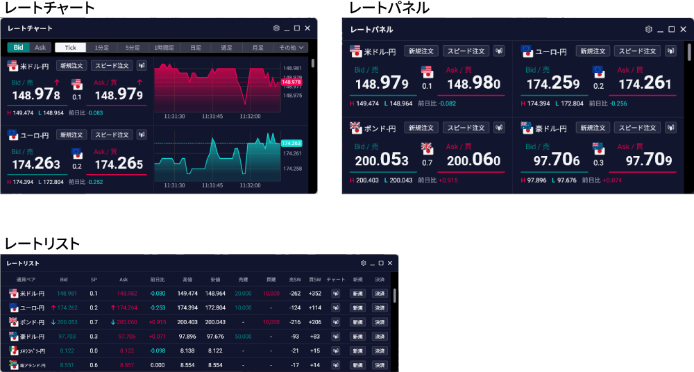 HYPER SBI FXでは、レートチャート、レートパネル、レートリストという3種類の画面で、リアルタイムのレートを確認できます。これらの画面では、気になる通貨ペアがお好みの順序で表示されるように設定できるため、効率よくレートの確認や発注ができます。