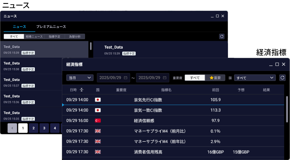 各国の政策金利や要人発言、為替分析などの外国為替取引に関するニュースを閲覧できます。また、主な経済指標について、発表(予定)日時、前回値、予想値、発表された実際の値などを一覧で確認することができます。