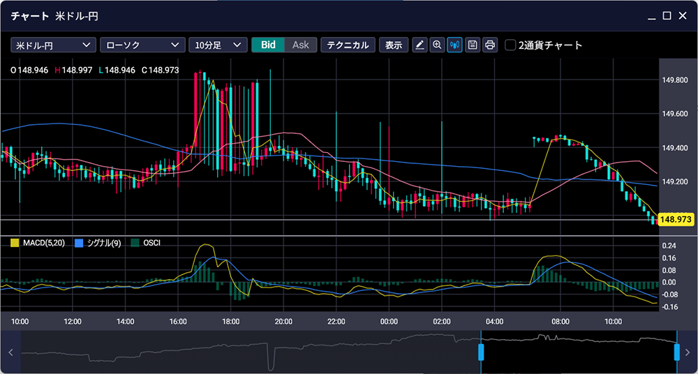 SBI HYPER SBI FXでは、値動きの方向性を分析する移動平均線、ボリンジャーバンド、一目均衡表などのトレンド系指標や、売買のタイミングを探るMACDなどのオシレーター系指標を、チェックを入れるだけでチャートに表示できます。