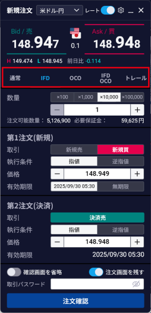SBI FXの取引では、通常の注文に加えて、IFD、OCO、IFDOCO、トレールといった注文パターンを利用できます。例えば、IFDは、新規建て注文とその決済注文を組み合わせて発注する注文パターンで、最初の注文が約定しない限り後者の注文は無効となります。為替のさまざまな局面に合わせて、注文パターンを使い分けることができます。