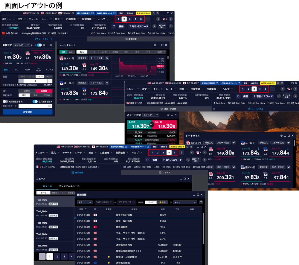 HYPER SBI FXでは、複数の画面レイアウトを同時進行で利用できます。例えば、ある画面レイアウトでは、発注の準備のために「新規注文」画面や「レートチャート」画面を開いておき、別の画面レイアウトでは、情報収集のために「ニュース」画面や「経済指標」画面を開いておくことができます。