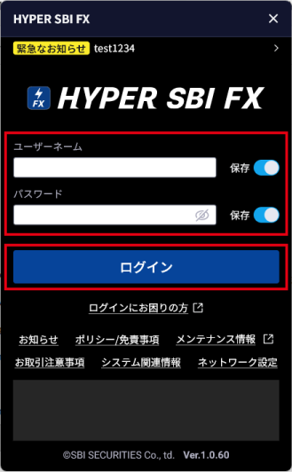 項目 説明 緊急なお知らせ クリックすると、緊急のお知らせがある場合に、内容を確認できます。 ユーザーネーム ユーザーネームを入力します。「保存」をオンにすると、次回ログインする際にユーザーネームの入力を省略できます。ユーザーネームを変更した場合、保存したユーザーネームは変更されませんのでご注意ください。 パスワード ログインパスワードを入力します。「保存」をオンにすると、次回ログインする際にログインパスワードの入力を省略できます。パスワードを変更した場合、保存したパスワードは変更されませんのでご注意ください。 ログイン クリックすると、HYPER SBI FXにログインします。 ログインにお困りの方 クリックすると、ログインパスワードの再設定や再発行についての情報を確認できます。 お知らせ クリックすると、お知らせがある場合に、内容を確認できます。 ポリシー/免責事項 クリックすると、当社のポリシーや免責事項などを確認できます。 メンテナンス情報 クリックすると、定期・臨時システムメンテナンスのお知らせを確認できます。 お取引注意事項 クリックすると、外国為替保証金取引(SBI FX)のリスク情報を確認できます。 システム関連情報 クリックすると、システムメンテナンス情報などを確認できます。 ネットワーク設定 クリックすると、「ネットワーク設定」画面が表示され、プロキシの利用設定ができます。 HYPER SBI FXが起動します。