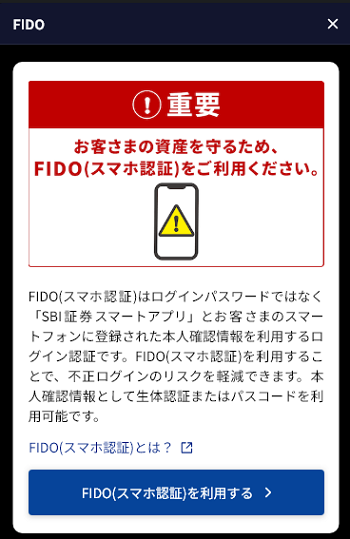「FIDO(スマホ認証)をご利用ください」という画面が表示された場合は、「スマホ(FIDO認証)を利用する」ボタンからSBI証券 スマートアプリの利用開始方法の詳細を確認できます。
