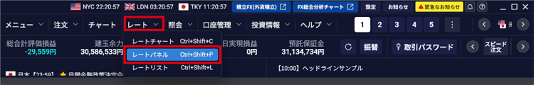 - 1. メインメニューの「レート」-「レートパネル」をクリックする