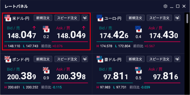 各種通貨ペアのレートをパネル表示で確認できます。