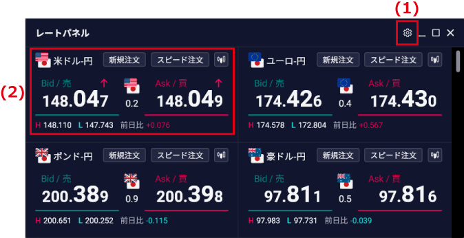 | (2) | 通貨ペア名 | 通貨ペアの名称が表示されます。 |