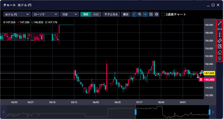 - 2. 分析線の種類を選択し、チャートの対象位置をドラッグして分析線を描画する