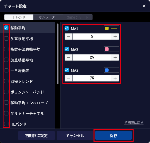 - 3. 対象のテクニカル指標にチェックを入れ、必要に応じてパラメータを変更し、「保存」ボタンをクリックする