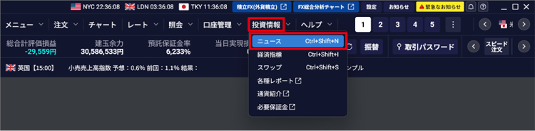 - 1. メインメニューの「投資情報」-「ニュース」をクリックする