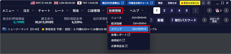 - 1. メインメニューの「投資情報」-「スワップ」をクリックする