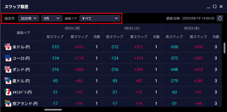 各種通貨ペアの、過去の指定月のスワップポイントを確認できます。