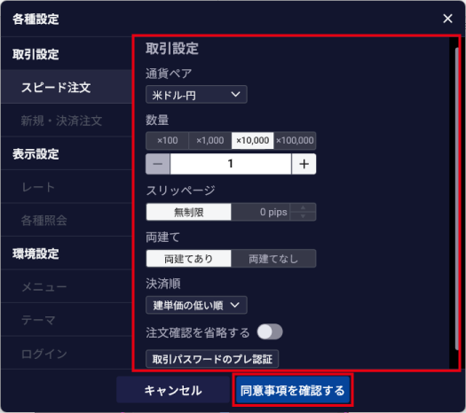 設定項目については、「スピード注文の取引設定を行う」を参照してください。