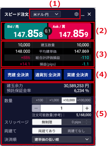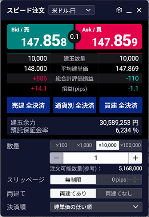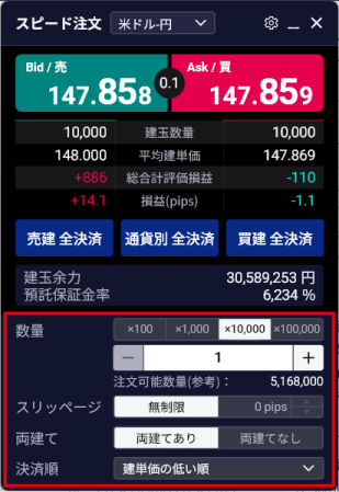 | (5) | 建玉余力、預託保証金率が表示されます。 必要に応じて、「数量」「スリッページ」「両建て」「決済順」を変更します。 |