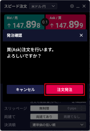 - 3. 注文確認操作を省略しない設定の場合は、確認メッセージが表示されるので、「注文発注」ボタンをクリックする
