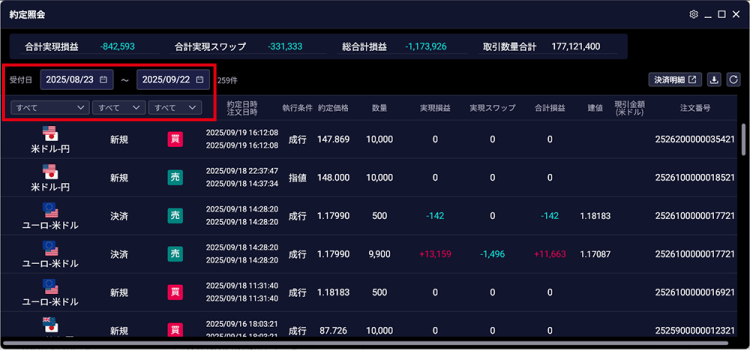 - 2. 必要に応じて、条件を設定して約定履歴を絞り込む