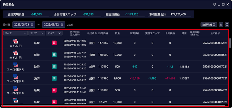 項目 説明 通貨ペア 通貨ペアが表示されます。 取引 新規注文、決済注文のいずれであるかが表示されます。 売買 「売」「買」のいずれの取引であるかが表示されます。 約定日時 建玉の約定日時が表示されます。 注文日時 注文受付日時が表示されます。 執行条件 約定時の執行条件が表示されます。 約定価格 約定時の価格が表示されます。 数量 約定建玉の数量が表示されます。 実現損益 実現損益が表示されます。 実現スワップ 実現スワップが表示されます。 合計損益 合計損益が表示されます。 建値 建値が表示されます。 現引金額(米ドル) 現引金額(米ドル)が表示されます。 注文番号 注文番号が表示されます。