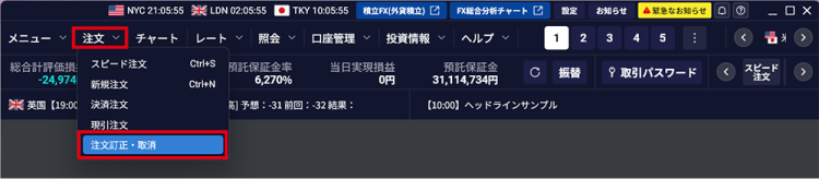 - 1. メインメニューの「注文」-「注文訂正・取消」をクリックする
