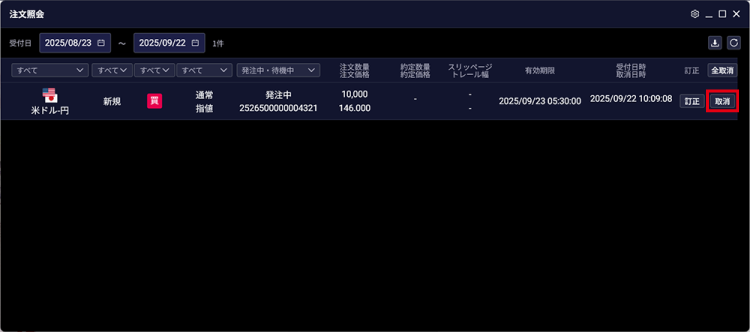 - すべての注文を取り消す場合は、「全取消」ボタンをクリックします。