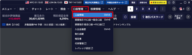 - 1. メインメニューの「口座管理」-「口座情報」をクリックする