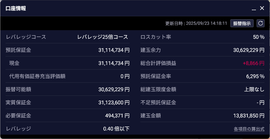 「想定元本=建玉数量×現在値」ただし、両建ての場合、数量の多い方の建玉のみ想定元本となります。ロスカット率 設定中のロスカット率が表示されます。