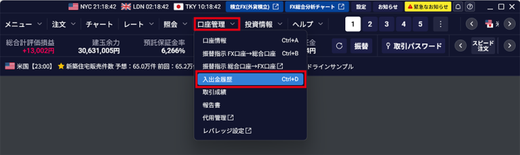 - 1. メインメニューの「口座管理」-「入出金履歴」をクリックする