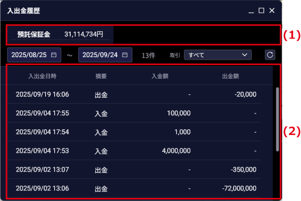 番号 項目 説明 (1) 預託保証金 現時点の預託保証金が表示されます。 (2) 入出金日時 入出金が発生した日が表示されます。 摘要 入出金が発生した取引の種別が表示されます。 入金額 SBI FX取引口座へ入金された金額が表示されます。 出金額 SBI FX取引口座から出金された金額が表示されます。