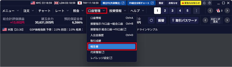 - 1. メインメニューの「口座管理」-「報告書」をクリックする