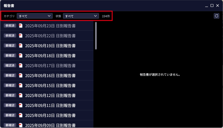 項目 説明 カテゴリ 絞り込む場合は、「日別」「月別」「年別」のいずれかにチェックを入れます。 報告書既読区分 絞り込む場合は、以下のいずれかにチェックを入れます。 - 要確認:報告書を参照していない状態です。