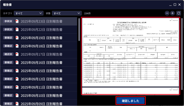 - 4. 報告書の内容を確認後、「確認しました」ボタンをクリックする