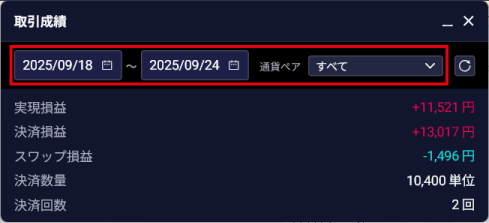 - 2. 必要に応じて、日付や通貨ペアなど、取引成績の確認条件を絞り込む
