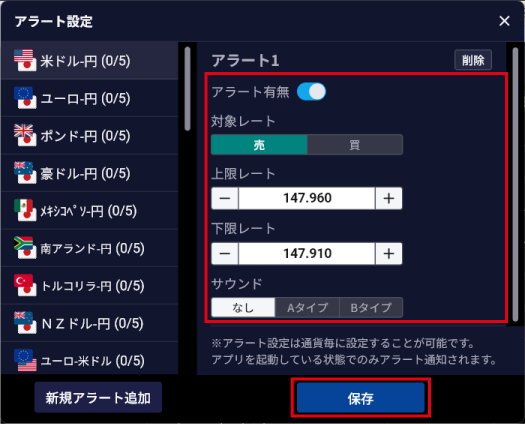 - 同一の通貨ペアについて、アラート設定を追加する場合は、「新規アラート追加」ボタンをクリックします。
