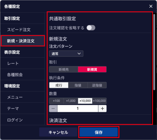 「各種設定を行う」 - 2. 「新規・決済注文」をクリックし、設定内容を変更して、「保存」ボタンをクリックする