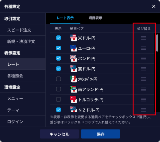 をドラッグ&ドロップして通貨ペアを並べ替える