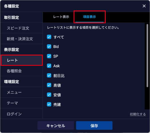 「各種設定を行う」 - 2. 「レート」をクリックし、「項目表示」タブをクリックする