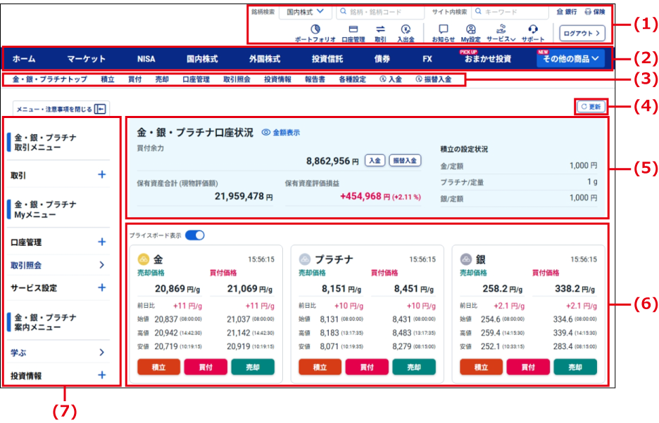 金・銀・プラチナ取引サイトのホーム画面について、画面構成を説明します。
