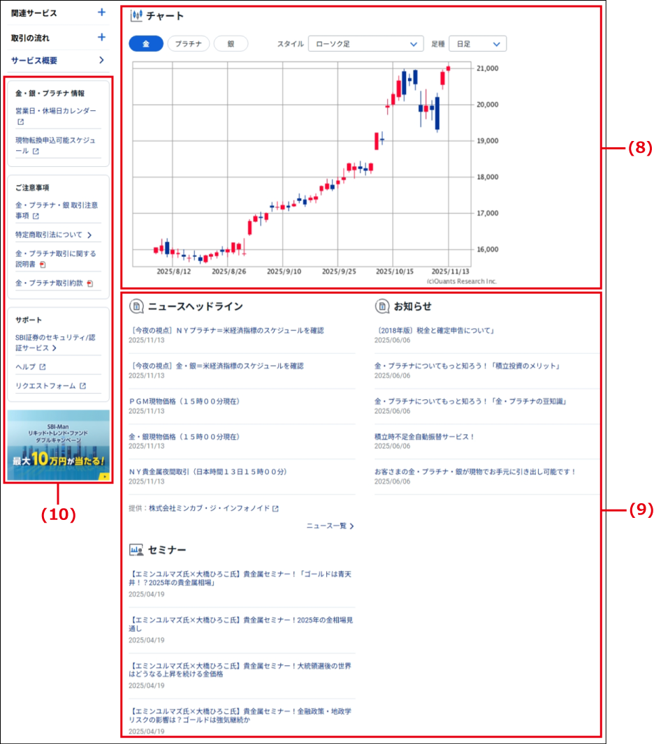 | (8) | チャート | 金・銀・プラチナの値動きをチャートで確認できます。チャートの操作方法は、「商品のチャートを確認する」を参照してください。 |