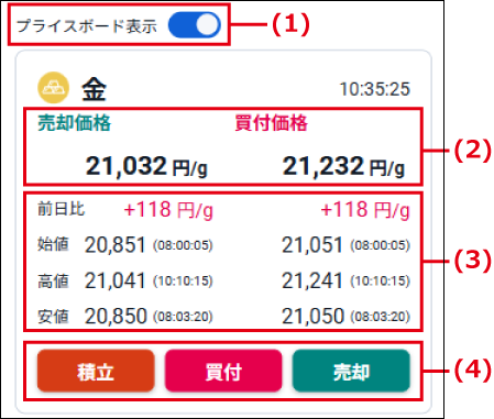 各商品の売却価格と買付価格の現在値が、5秒ごとの更新で表示されます。また、積立設定や買付・売却の画面を開くことができます。 |