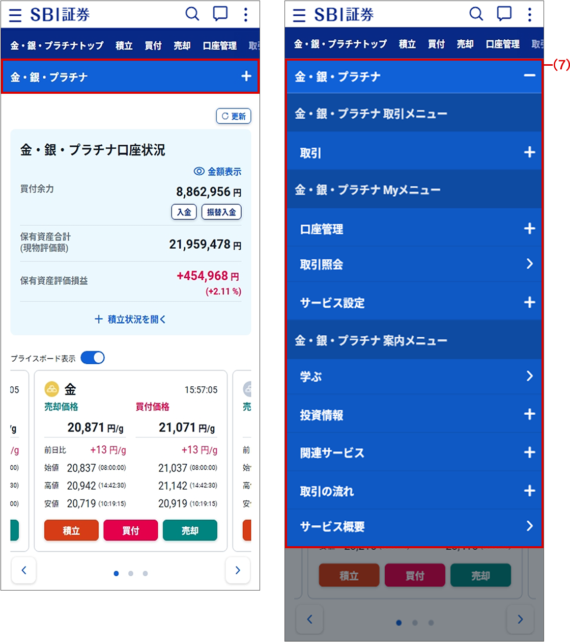 | (5) | 金額表示 | クリックすると、「金・銀・プラチナ口座状況」に表示されている金額を隠すことができます。もう一度クリックすると、金額が表示されます。 |