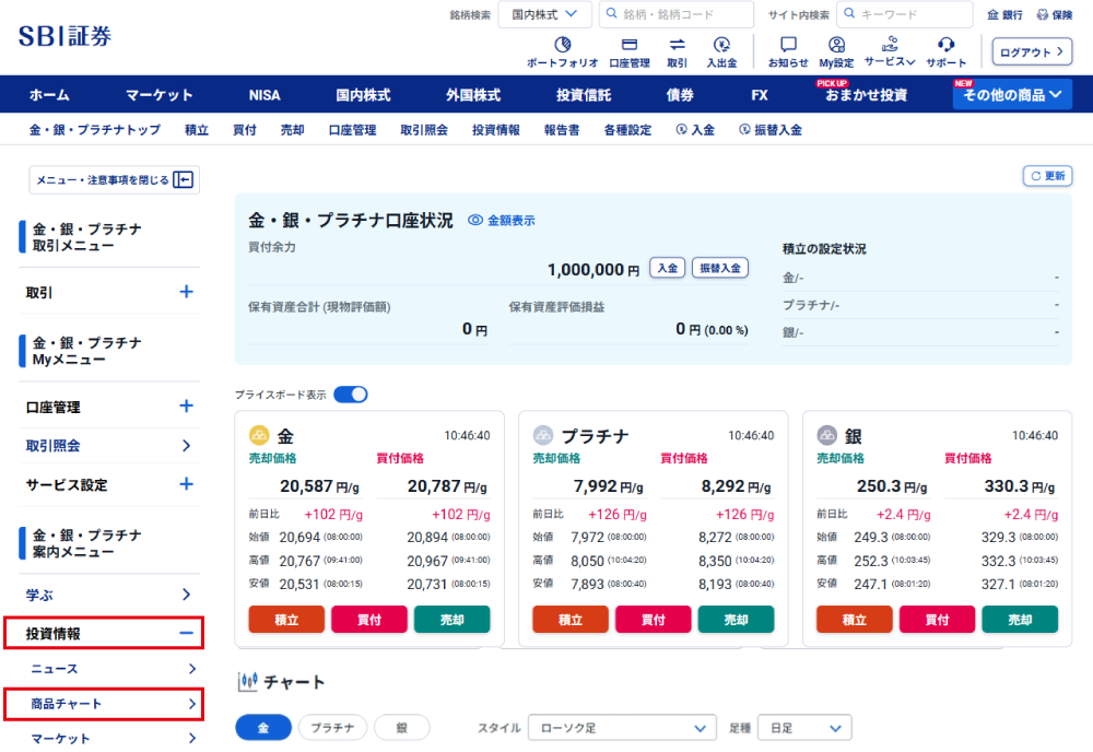 - 1. サイドナビの「投資情報」-「商品チャート」をクリックする