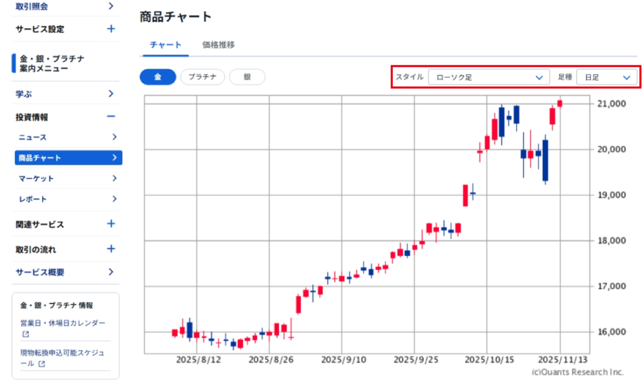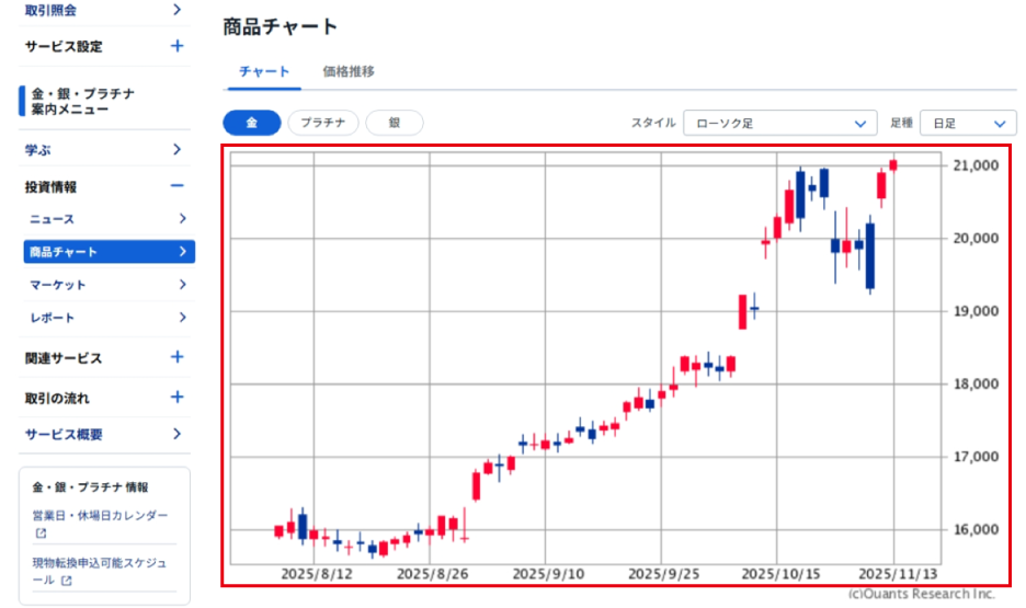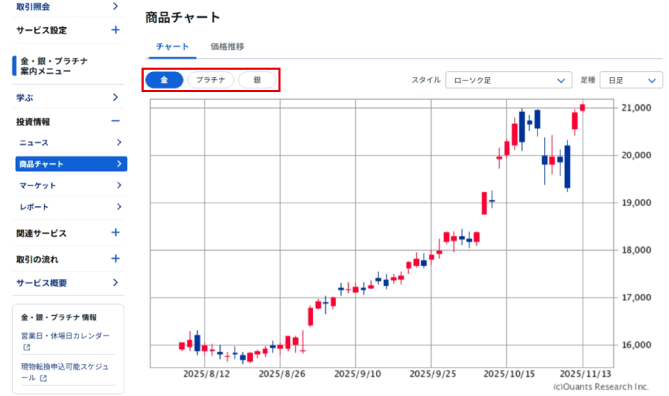 金・銀・プラチナの過去3ヵ月~3年分の値動きを、チャートで確認できます。