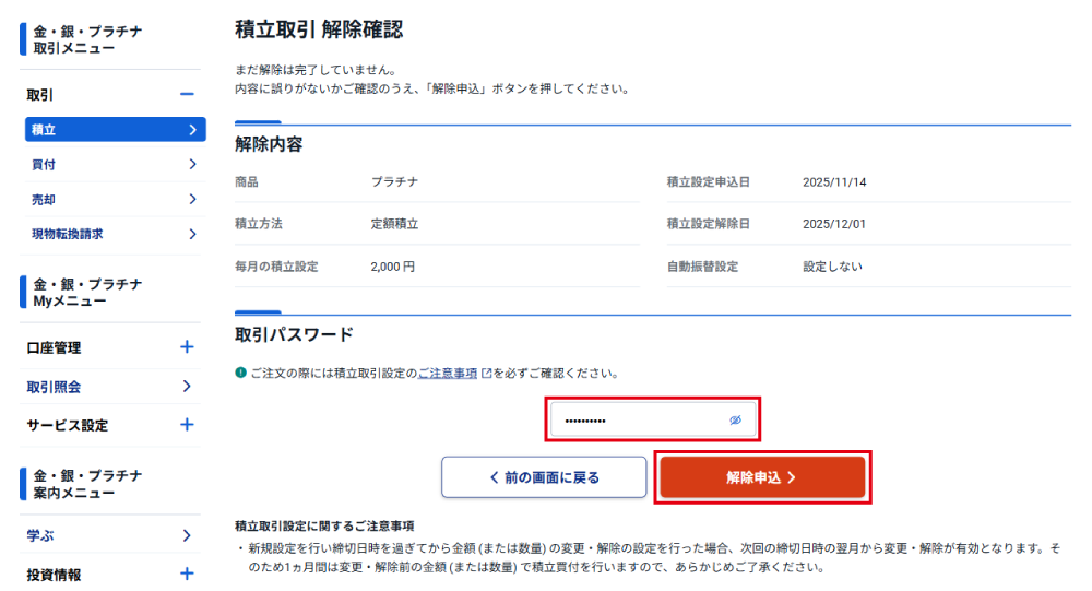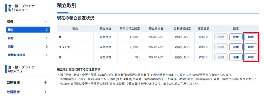 金・銀・プラチナの積立買付の設定を解除します。