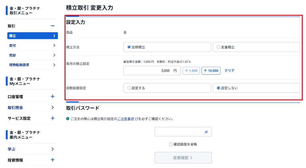 毎月の積立設定 毎月の積立金額または数量を入力します。 - 定額積立の場合:積立金額を1,000円以上1,000円単位で入力します。上限は1億円です。