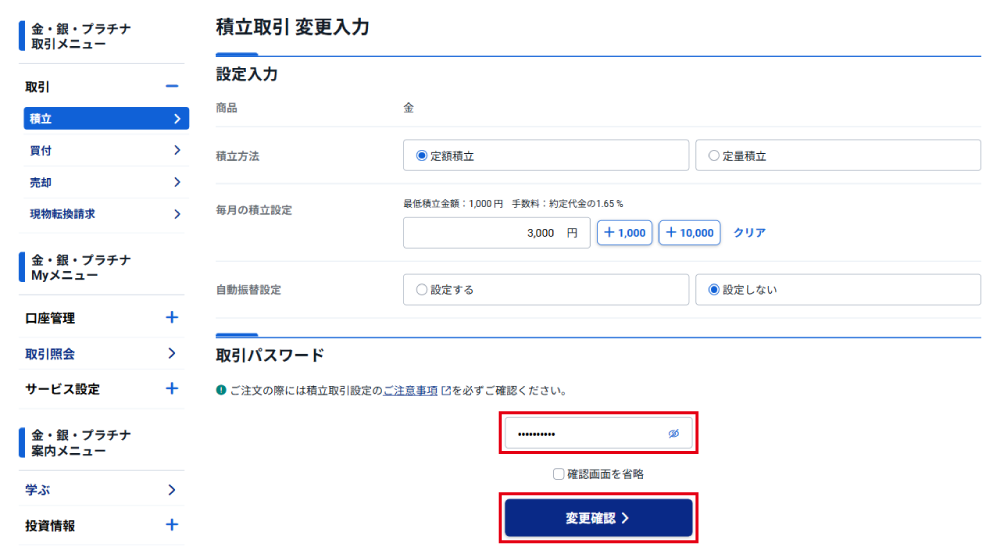 - 4. 取引パスワードを入力し、「変更確認」ボタンをクリックする