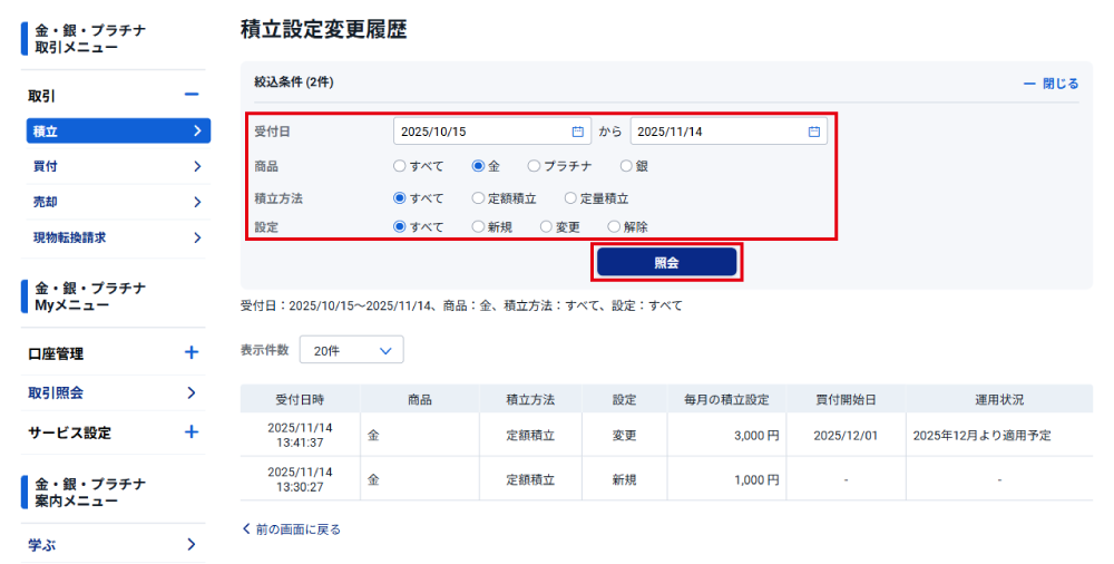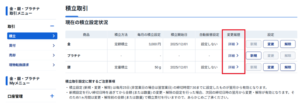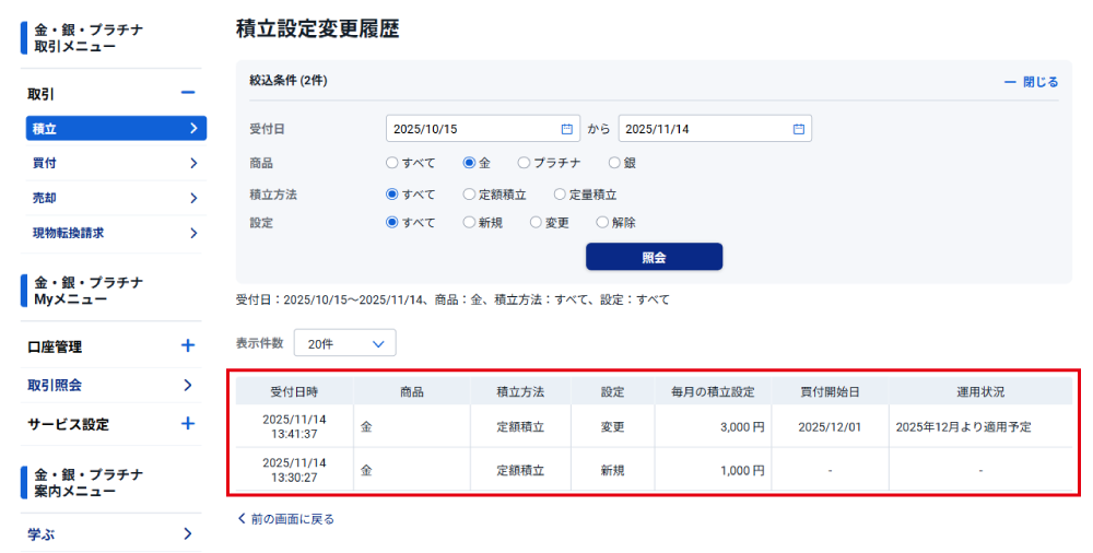 金・銀・プラチナの積立設定について、新規・変更・解除の履歴を確認できます。