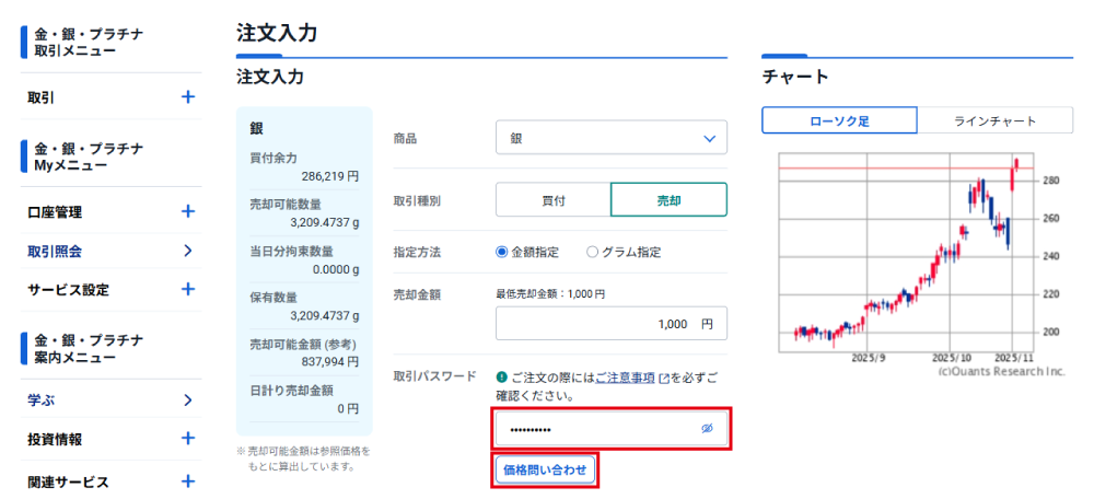 - 3. 取引パスワードを入力し、「価格問い合わせ」ボタンをクリックする