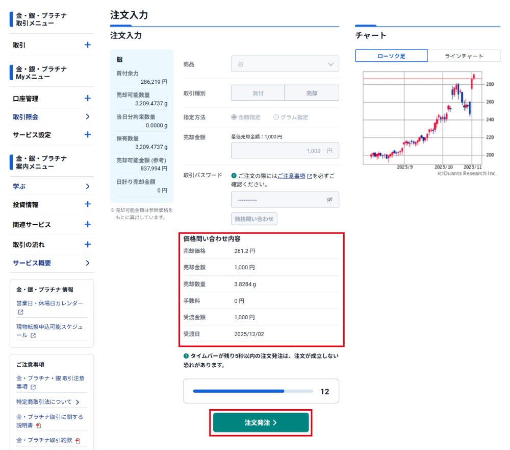 タイムバーが15秒からカウントダウンを開始します。 - 4. 価格問い合わせ内容を確認し、15秒以内に「注文発注」ボタンをクリックする