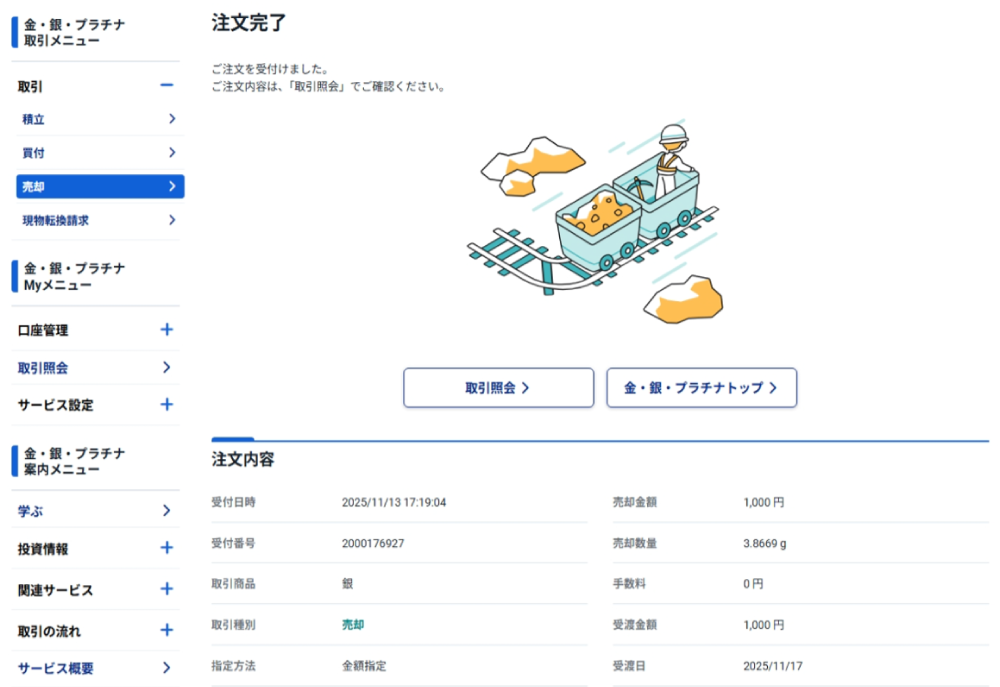 取引種別 「売却」が選択されていることを確認します。 指定方法 「金額指定」または「グラム指定」を選択します。 売却金額/売却数量 「金額指定」の場合は売却金額を、「グラム指定」の場合は売却数量を入力します。 - 売却金額:1,000円以上1,000円単位で入力します。1回の取引における上限は1億円です。